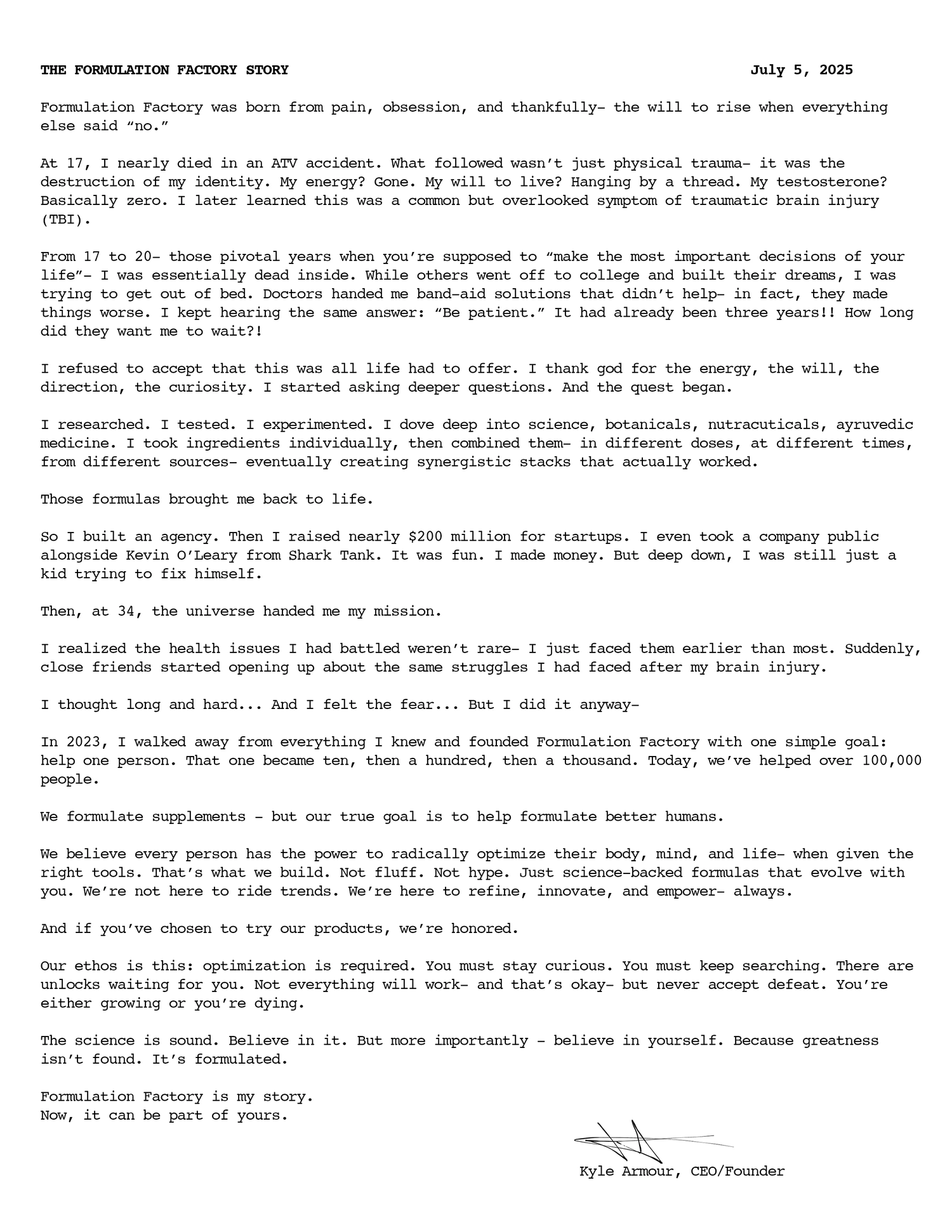 Formulation Factory started with my own story — a turning point that changed everything. When I was 17, I suffered a traumatic brain injury that left me mentally foggy, physically drained, and searching for answers. Traditional approaches didn’t help, so I began experimenting — diving into research, studying botanicals, nutraceuticals, and performance science to rebuild myself from the ground up. What I discovered not only helped me recover, it reignited my purpose.
